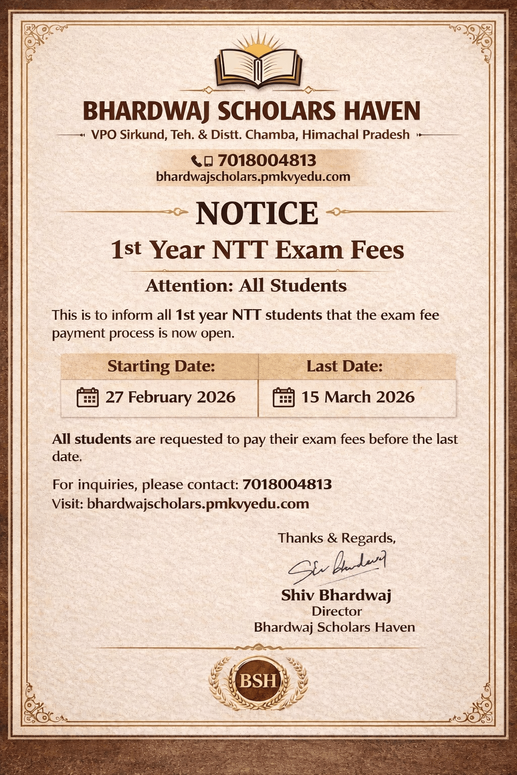 **Subject: Submission of 1st Year NTT Examination Fees** **Date: 27 February 2026** This is to i...