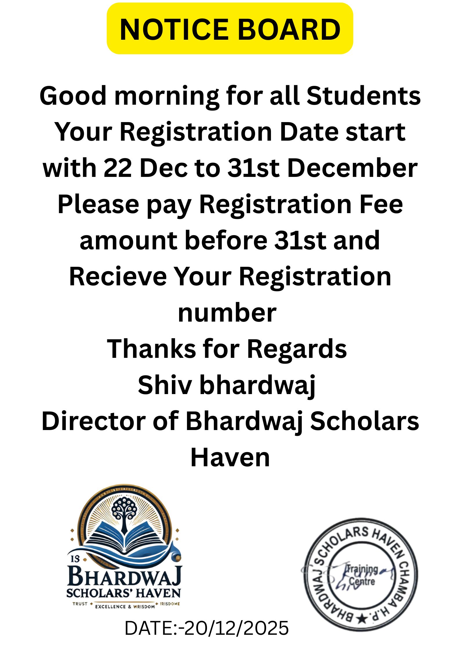 At Bhardwaj Scholars Haven, we believe that education is not just about degrees—it's about empowering individuals with the skills and confidence they need to succeed in the real world. Under the visionary leadership of our Director, Mr. Shiv Kumar, we are shaping a brighter, more skillful future for learners across India.